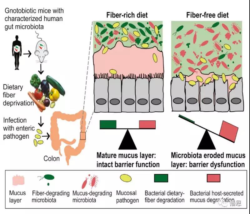 而飼喂大鼠缺乏膳食纖維的日糧(Fiber-freediet)時(shí),腸道黏膜的粘蛋白含量很少,形成的“墻”很薄,此時(shí)腸黏膜的屏障能力很差,而且致病微生物也已經(jīng)開始侵蝕腸上皮細(xì)胞。因此,給“二師兄”補(bǔ)充膳食纖維也是一種行之有效的提高“二師兄”“內(nèi)在修為”的途徑。