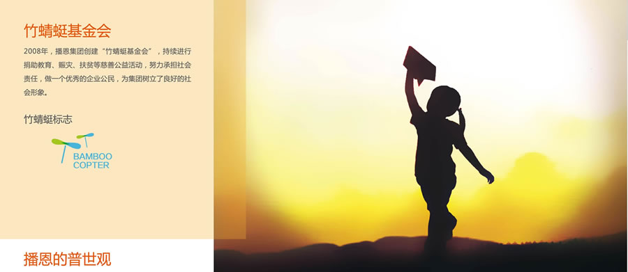 播恩于2008年創(chuàng)建“竹蜻蜓慈善”。持續(xù)進(jìn)行捐助教育、賑災(zāi)、扶貧等慈善公益活動(dòng),努力承擔(dān)社會責(zé)任,做一個(gè)優(yōu)秀的企業(yè)公民,為播恩樹立了良好的社會形象。