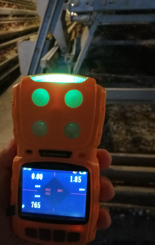 蛋雞舍通風(fēng)量不僅影響舍內(nèi)溫度的穩(wěn)定性和空氣質(zhì)量,更影響蛋雞的健康和生產(chǎn)性能。國(guó)內(nèi)傳統(tǒng)蛋雞舍主要是刮板式清糞系統(tǒng),其清糞周期較長(zhǎng),且存在飲水器漏水、清糞不徹底等問題,容易造成雞糞發(fā)酵,導(dǎo)致舍內(nèi)濕度、二氧化碳和氨氣濃度較高。為保證雞舍內(nèi)有害氣體不影響蛋雞的健康和生產(chǎn)性能,蛋雞舍內(nèi)二氧化碳濃度上限為 1500 mg/m3 ,蛋雞舍內(nèi)氨氣質(zhì)量濃度基本不會(huì)超過 15 ppm。見圖1、圖2。