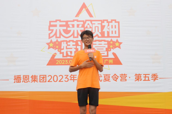 在學(xué)員發(fā)言環(huán)節(jié),本次訓(xùn)練營的優(yōu)秀學(xué)員代表李凱旭同學(xué)上臺發(fā)表感言。跟隨家長的足跡,李凱旭很高興能親自走進播恩,切身感受播恩文化與工作環(huán)境。他期待著,在播二代夏令營“理想行動、擔(dān)當(dāng)大同”口號的鞭策下,努力成為更好的自己,探索未至之境,暢游科學(xué)海洋,立志領(lǐng)袖夢想。李凱旭分享了夏令營期間的點滴收獲,希望可以通過自己的努力考上更好的大學(xué),成為真正的播恩人。