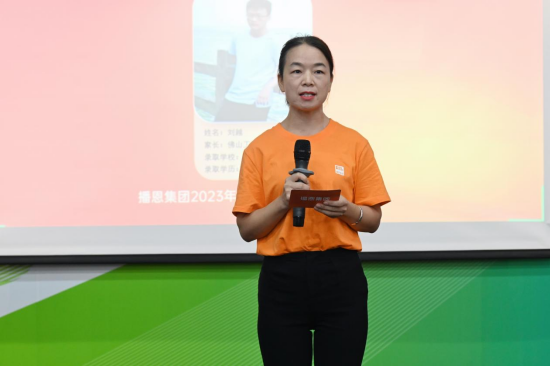 本次金榜題名頒獎典禮,還特別邀請到了劉越(福建農(nóng)林大學(xué) 碩士研究生)的家長——馬良贏(佛山工廠綜合部綜合員,2023最美播恩人)作為家長代表發(fā)言。她首先對集團(tuán)一直以來提供的高水平員工福利表示衷心的感謝,從本次金榜題名活動中,她也感受到深深的員工關(guān)懷。她十分感謝集團(tuán)提供了這樣一個和大家分享喜悅的機(jī)會,并表示以后會更加珍惜自己的工作崗位,努力做更優(yōu)秀的播恩人,努力培養(yǎng)孩子成長成材,最后祝集團(tuán)發(fā)展越來越好,未來蒸蒸日上。